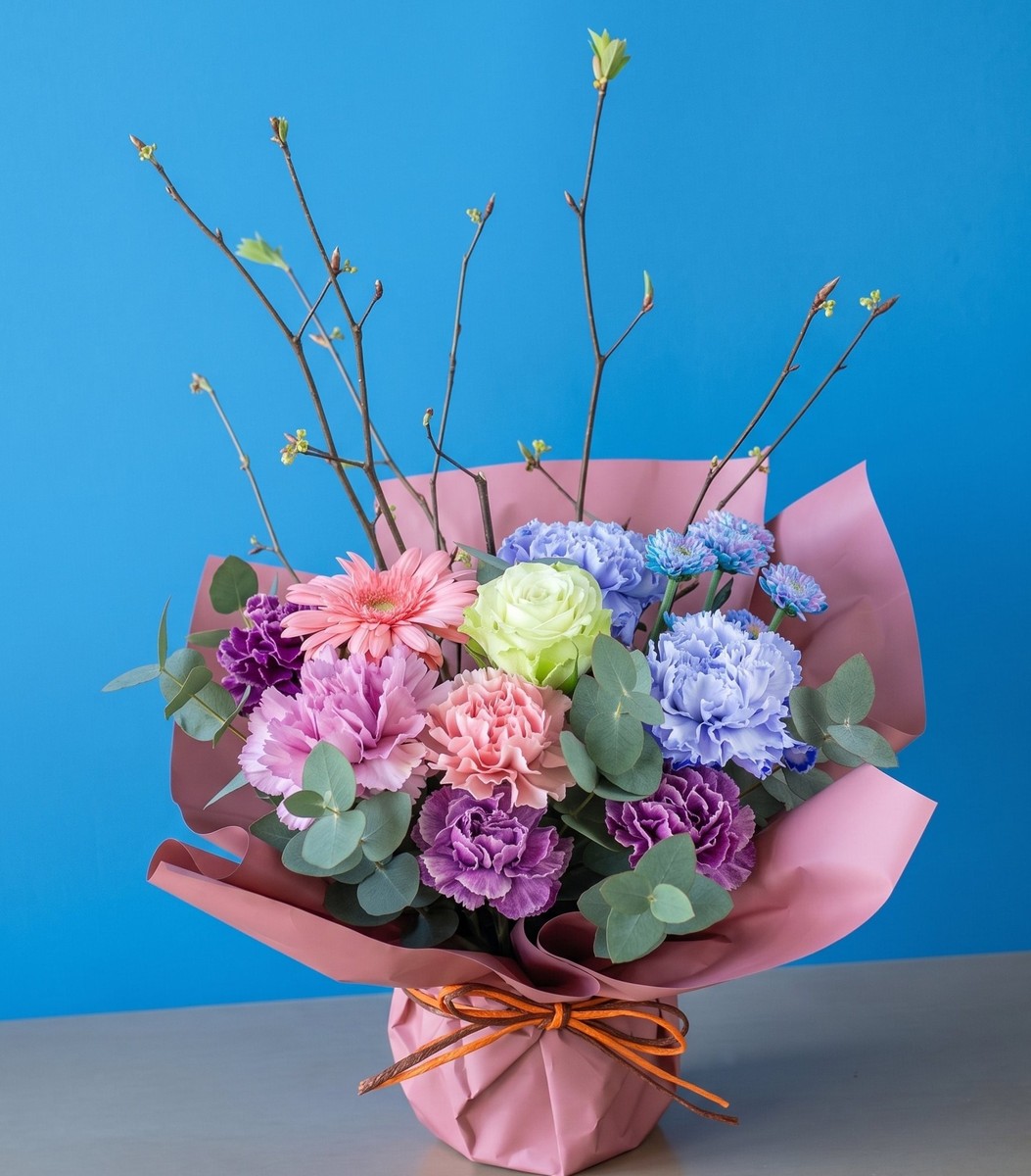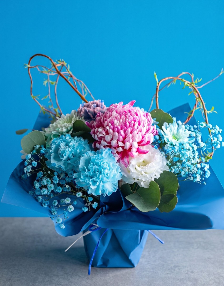 (税込3,520円)ありがとうを爽やかに贈るブルー系のフラワーアレンジメント