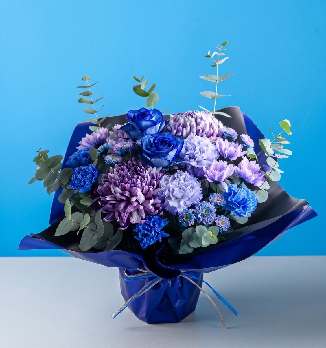 カラーシリーズの一番人気色「ブルー」です。染め花のオレンジを使用したアレンジメント。ボリュームもあります。インパクト抜群のゴールドバラオプションやお花のラメ加工、くまさんピックもおすすめです!