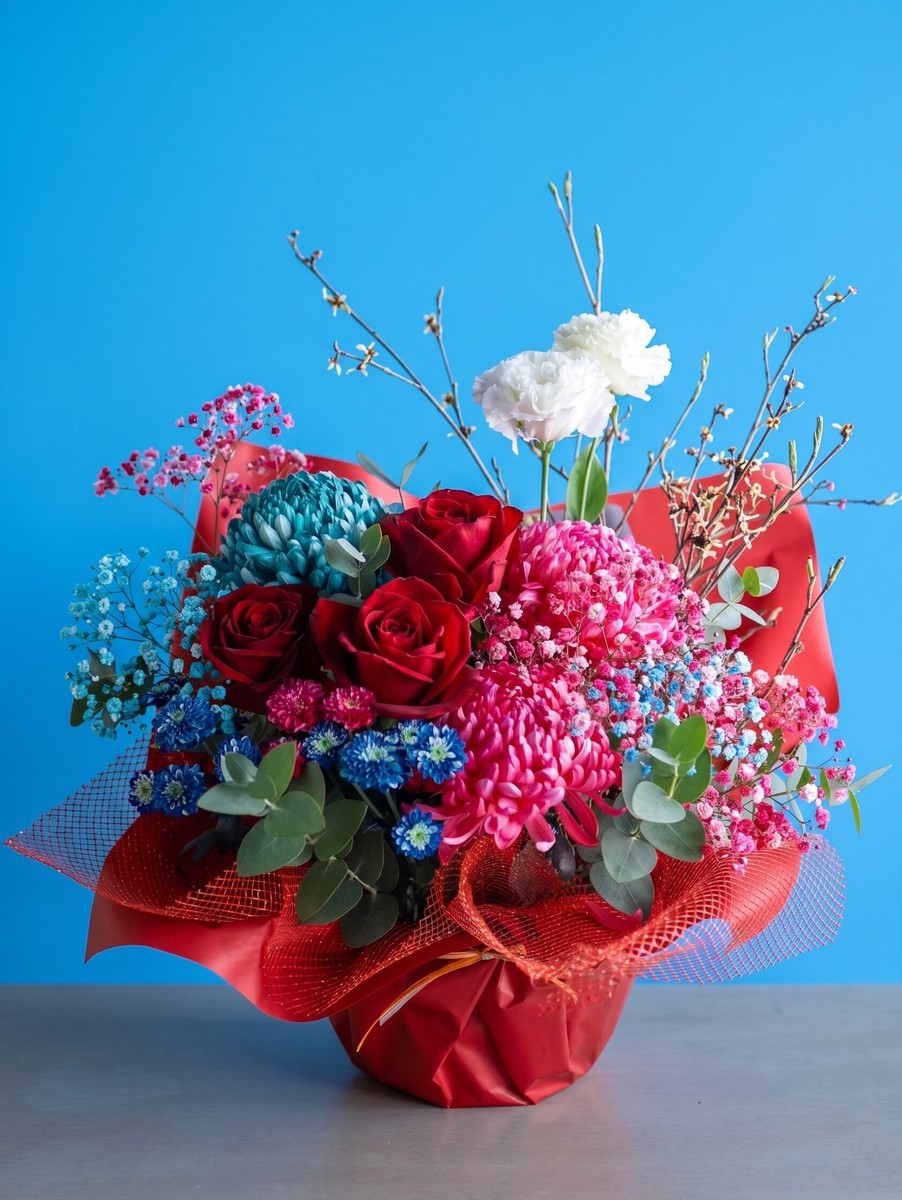 ※写真はイメージです。染め花をメインに使用したカラフルなお花です。