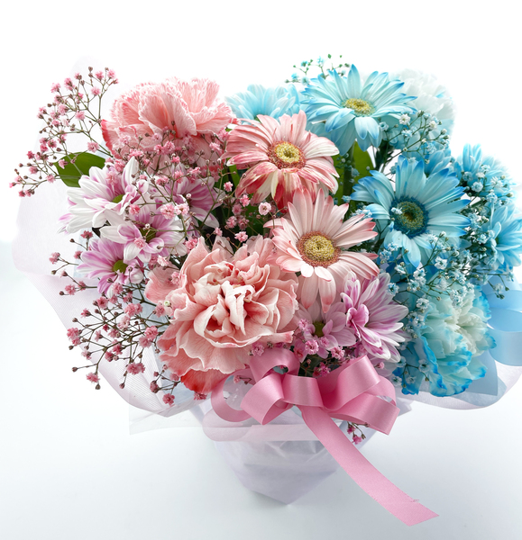 <誕生日祝いの花>フラワーアレンジメント *ターコイズ&ピンク*