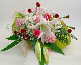 人気商品!ピンクのユリとバラでボリュームたっぷりにまとめたスタンダードなお祝い花です